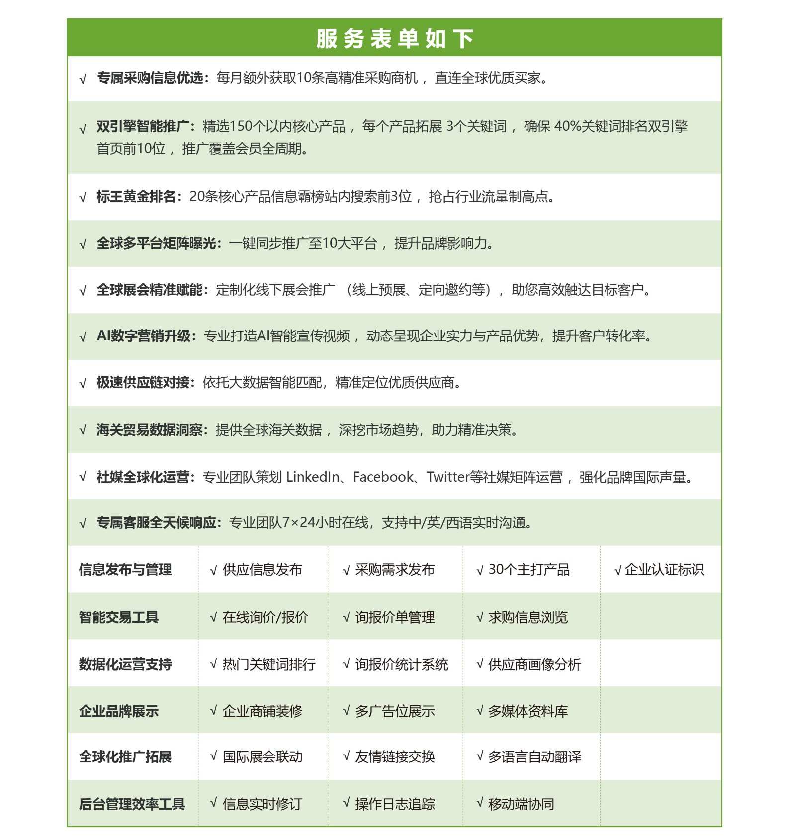 1. 专属采购信息优选:每月额外获取10条高精准采购商机 ,直连全球优质买家。